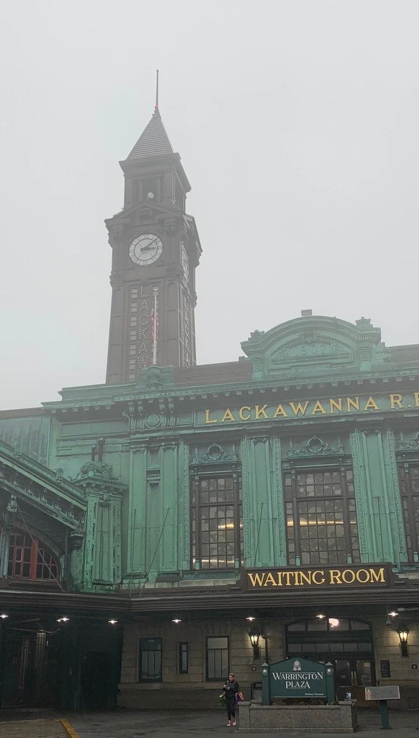 Math at work: clock tower at Hoboken terminal keeps time even on a misty day.