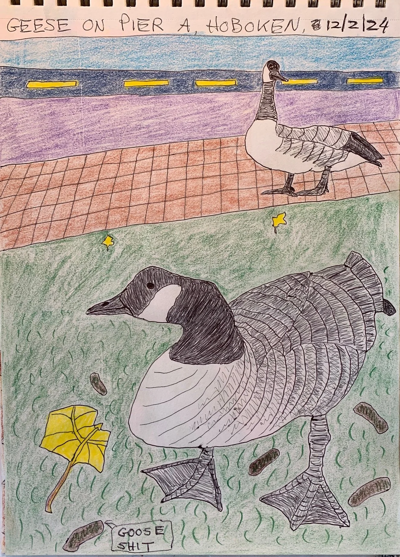 I don’t especially like the geese overrunning the Hoboken waterfront, but drawing this pair helped me forget the human shitshow.