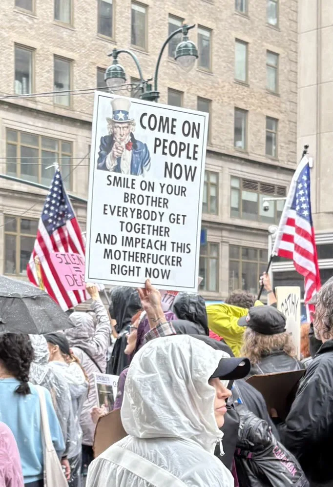 My Uber driver is a young guy with an accent. I tell him--with trepidation, he could be a Trumper--that I’m going to a No Kings protest. Good for you! he says. If he wasn’t working, he’d go too! He came here from Algeria because American is a free country, he wants to raise his son and daughter here. Now he’s worried that America is becoming just another dictatorship.