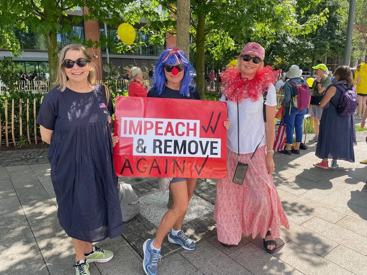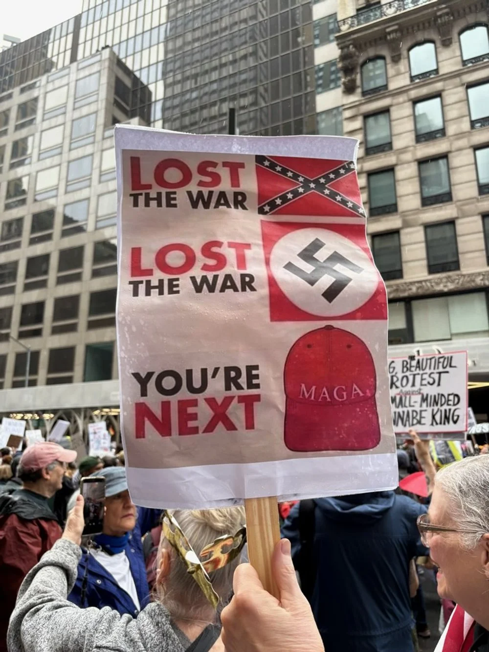 Almost everyone seems to be carrying a sign. A sampling: “NO CROWN FOR A CLOWN.” “WHEN CRUELTY BECOMES NORMAL, COMPASSION LOOKS RADICAL.” “I HATE TRUMP FOR FREE “(because Trump and Musk claim all protesters are paid). “PROTECT NEIGHBORS, NOT NAZIS.” “CONGRESS, DO YOUR JOB. IMPEACH TRUMP. NO KINGS.” “AMERICA: NO KINGS SINCE 1776.” “NO FAUX-KING WAY.” (took me a while to get that). “SENDING THE MILITARY TO AMERICAN CITIES IS… FASCISM!” “’DON’T MAKE ME REPEAT MYSELF’: HISTORY.”